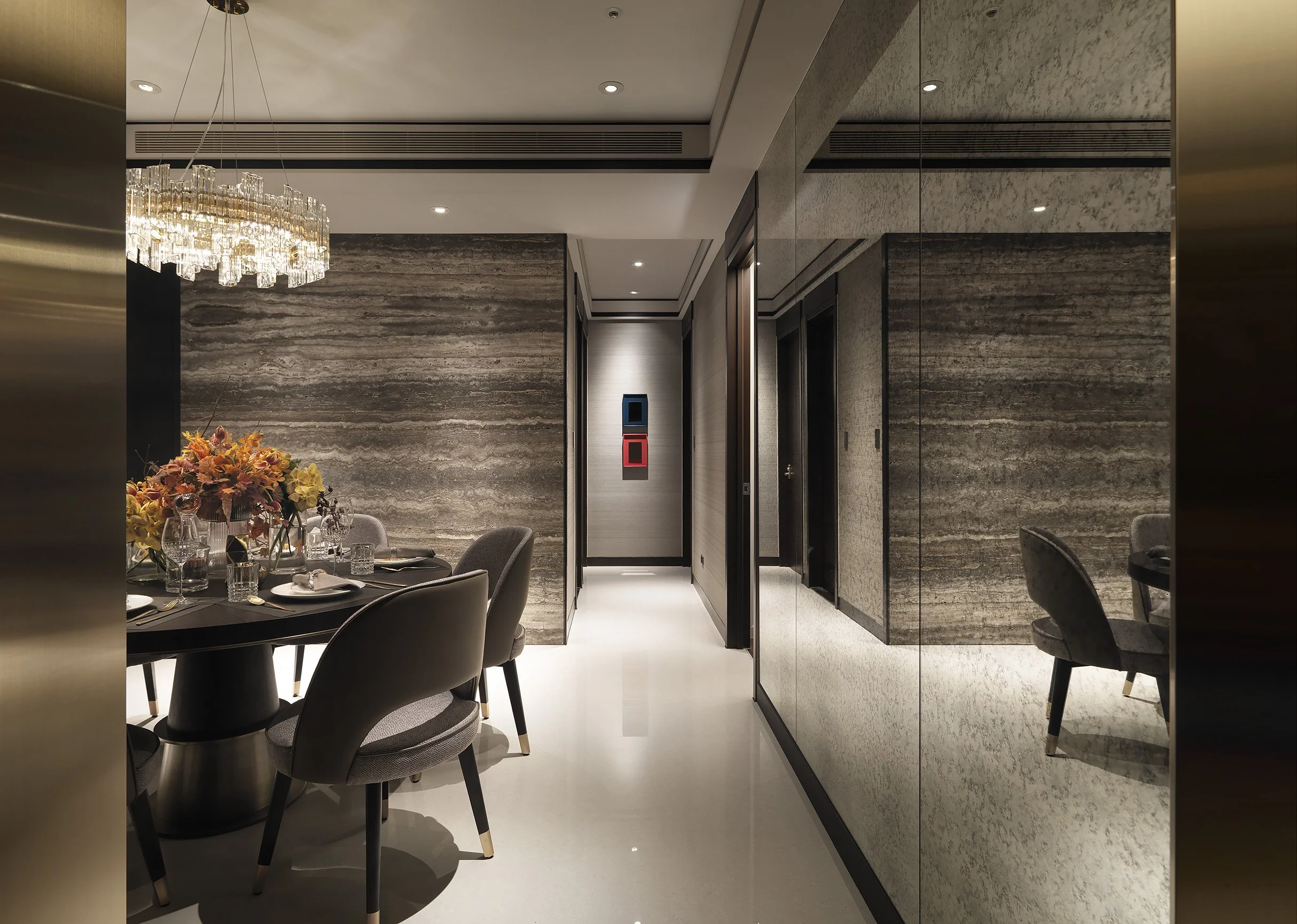 御景跳脫制式設計方式, 活用鍍鈦金與鏡面等材質,在倒影虛實穿梭之中, 讓空間更顯寬敞、大氣, 巧妙解決了都會建築中,常見的小坪數封閉規格問題. 另外,搭配現代感簡約家具和精緻的金色貝殼立體雕飾, 不多不少, 重新詮釋現代新東方美學,華麗且內斂的居家風格.
